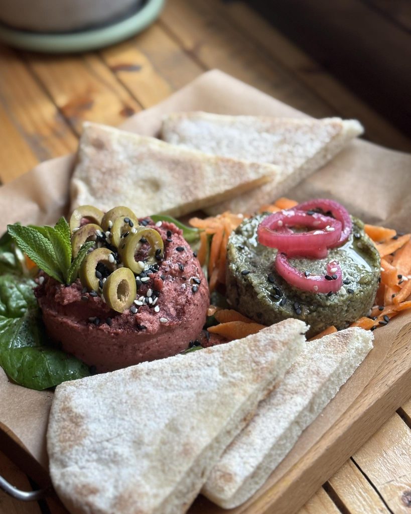 pastă de năut cu sfeclă roșie, pastă de semințe de dovleac, turtă